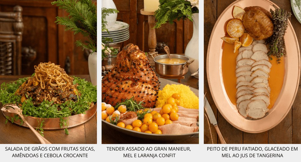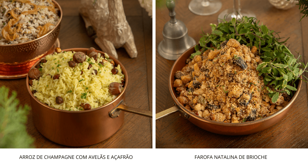 O Arroz de Champagne com Avelãs e Açafrão e a Farofa Natalina de Brioche com Pancetta, Figo Seco, Tâmaras e Nozes Pecan são opções que complementam perfeitamente o menu.