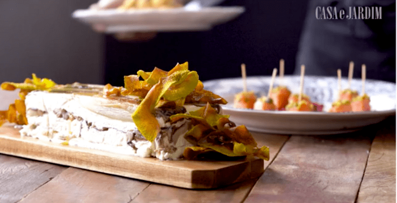 Além de funcionar como petisco, o terrine de shitake criado pelo chef Paulo Neves também serve como acompanhamento. Para decorar o prato, são utilizadas chips de abóbora.
