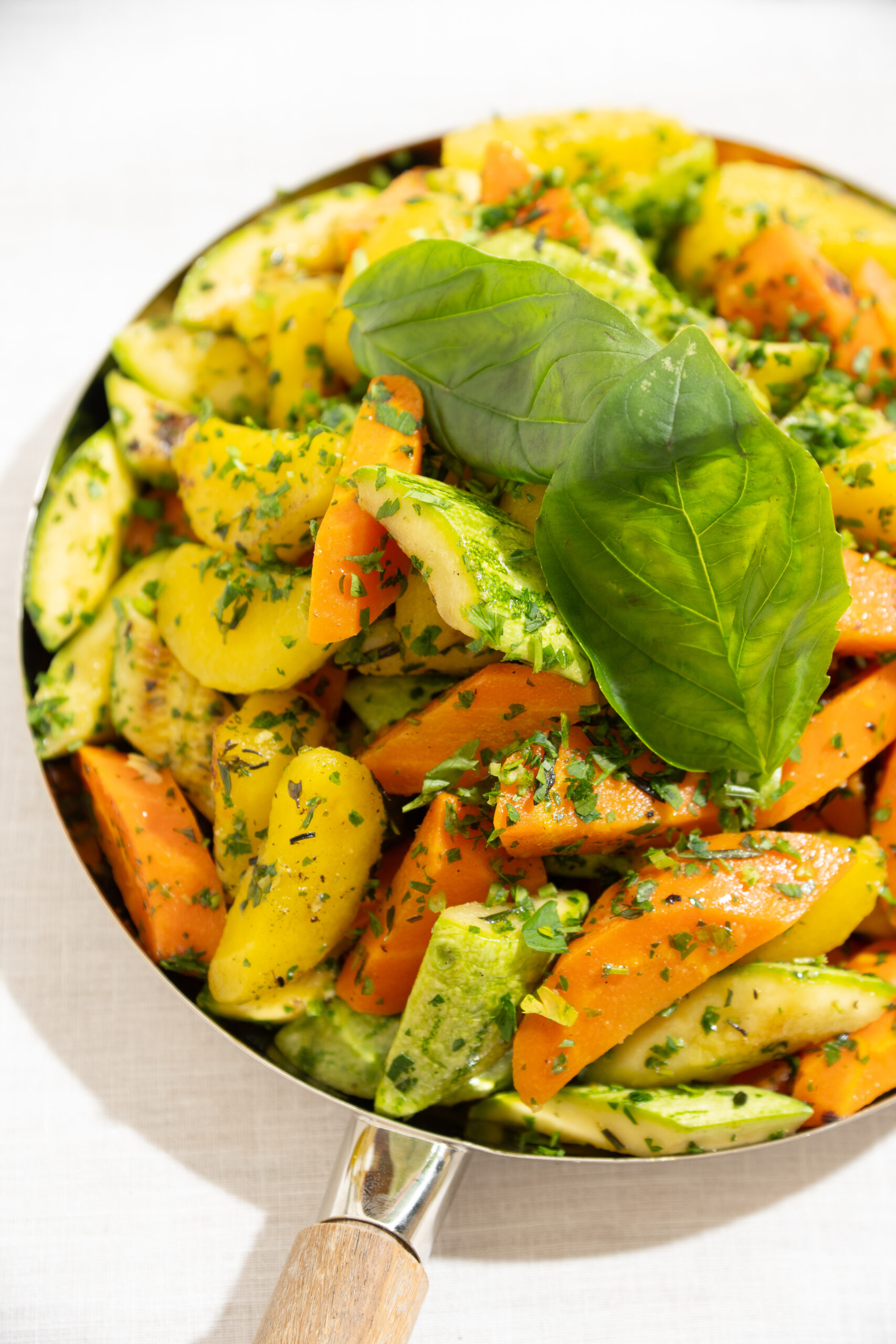 Mix de legumes frescos salteados no azeite com ervas aromáticas. (abobrinha, cenoura e mandioquinha).