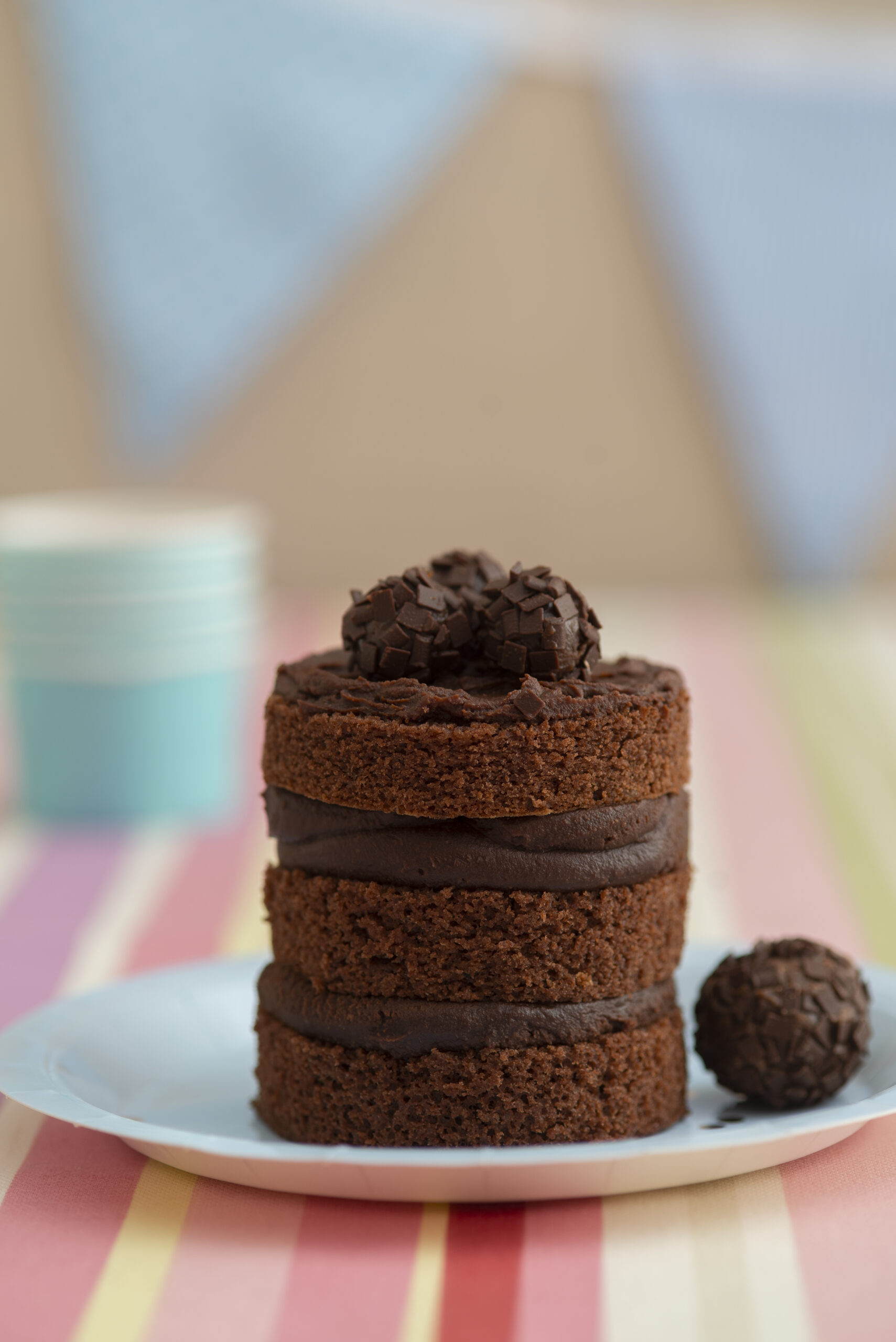 Mini bolo de chocolate com camadas de brigadeiro ao leite.
