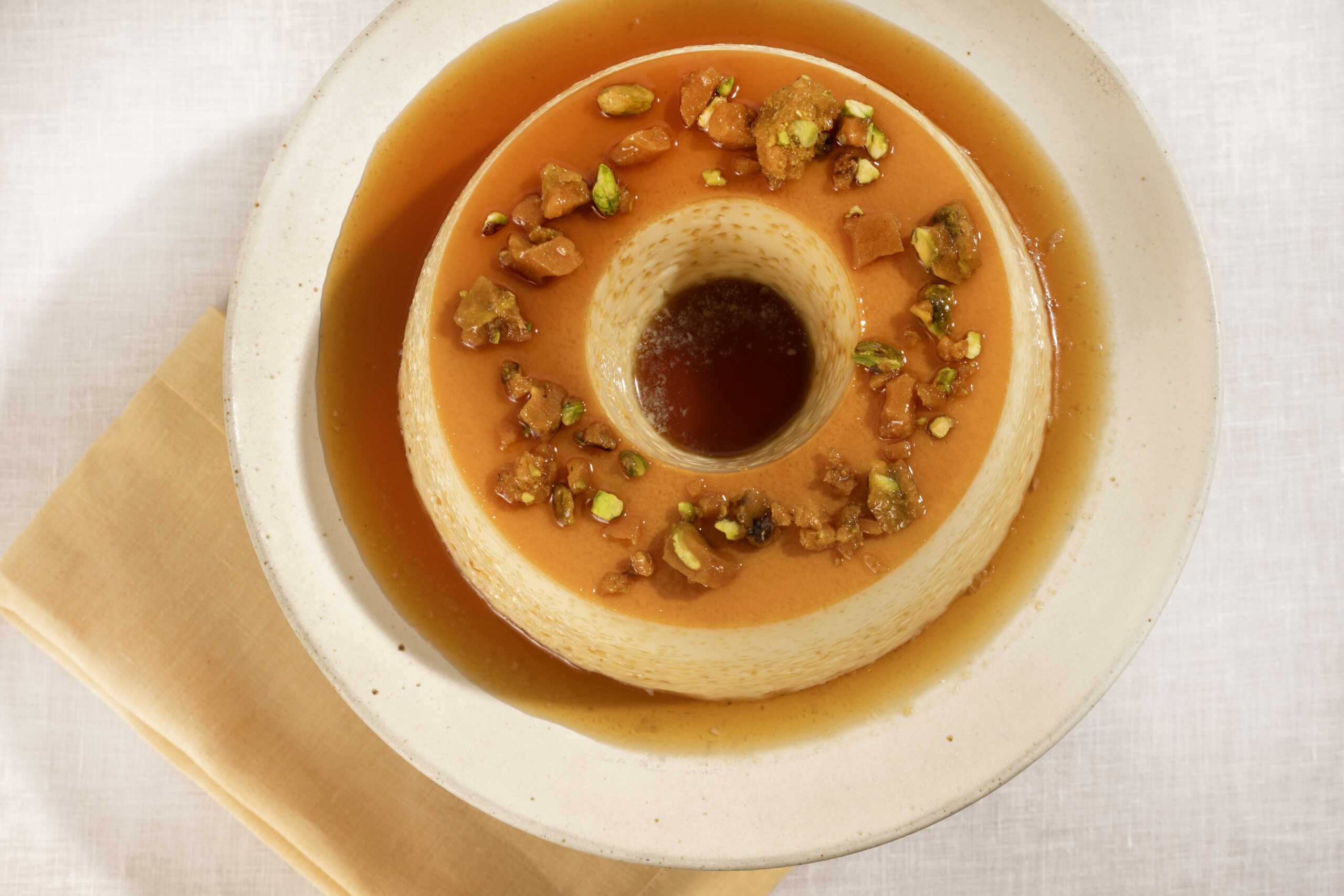 Pudim de leite de ficar na memória. Textura lisinha, firme e cremosa. Acompanha calda de açúcar e crocante de pistache.
