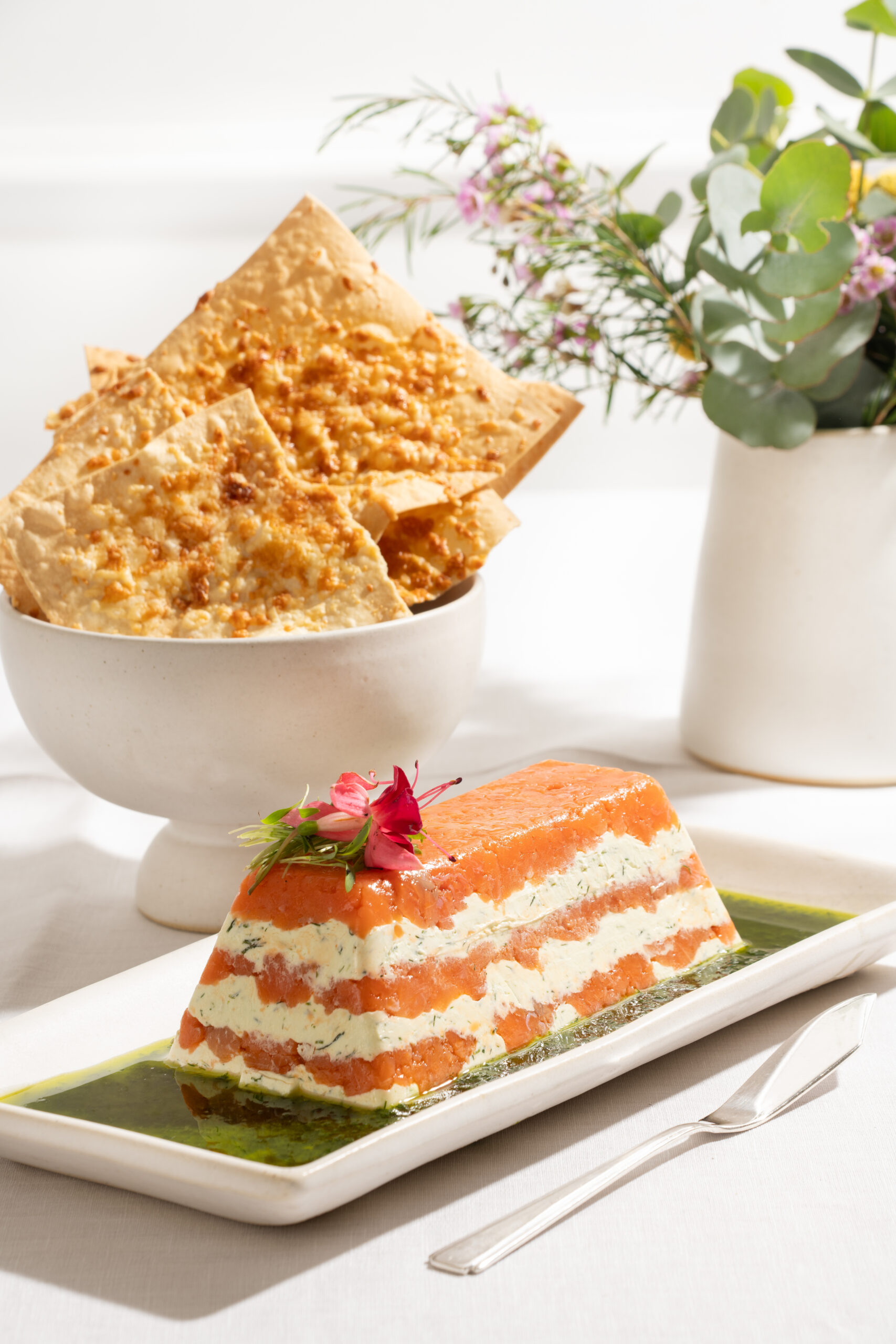 Terrine de salmão defumado com panacota de dill e seu pesto. Acompanha pão placa de parmesão Pequena
