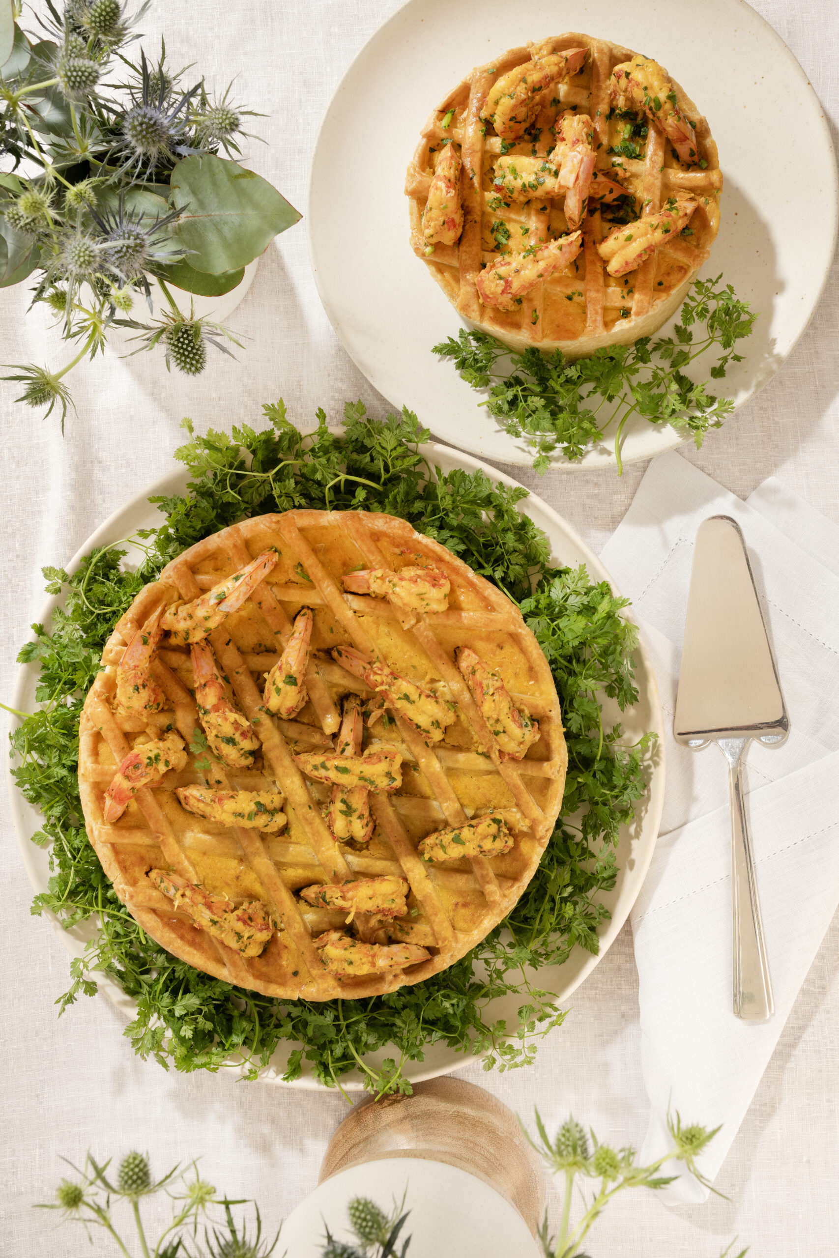 Torta com delicioso recheio cremoso de camarões salteados e leve toque de temperos frescos, em massa dourada e amanteigada.